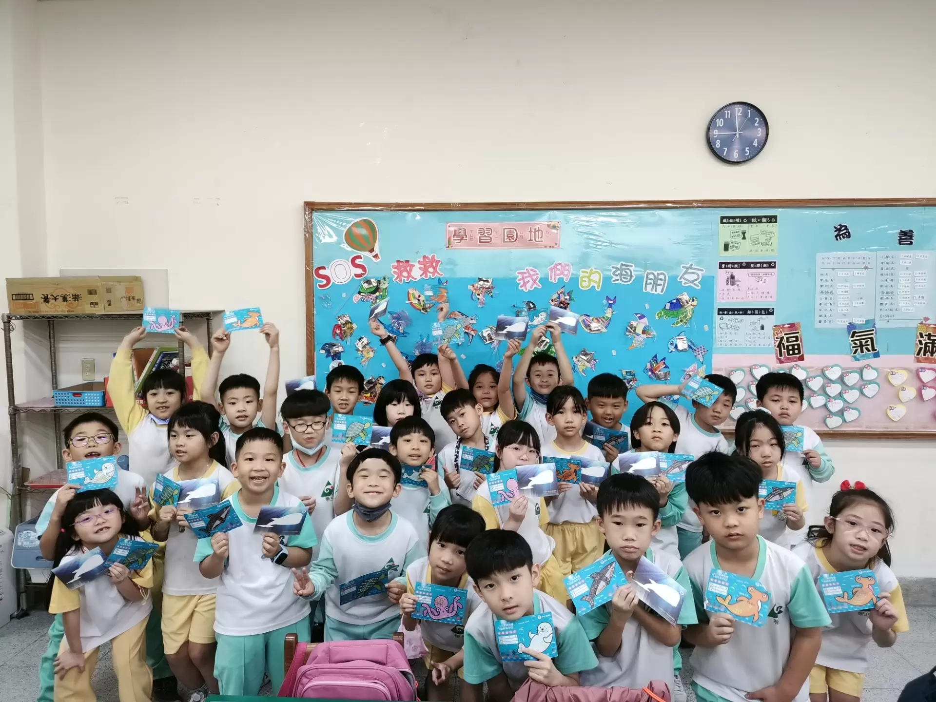上學期利用美勞課請學生畫自己喜愛的海洋生物,佈置成一片美麗的海洋世界,名為「我們的海朋友」。一個月後利用放學後的時間,在每隻海洋生物的身上貼了四樣塑膠垃圾,其中兩樣還是全班吃的點心留下來的外包裝。並在標題上加上了「SOS救救」,連起來就是「SOS救救我們的好朋友」,然後邀請學生淨塑集點,只要集滿100點,就能拆下一樣塑膠垃圾,救下自己的海洋生物。學生認真集點,因為想要救自己的海洋生物,當可以拆下牠們身上的塑膠垃圾時,學生都非常開心而且很有成就感,點數不夠的學生看著別人能夠拆下塑膠垃圾,都投以羨慕的眼光,相信接下來會更努力的淨塑集點。