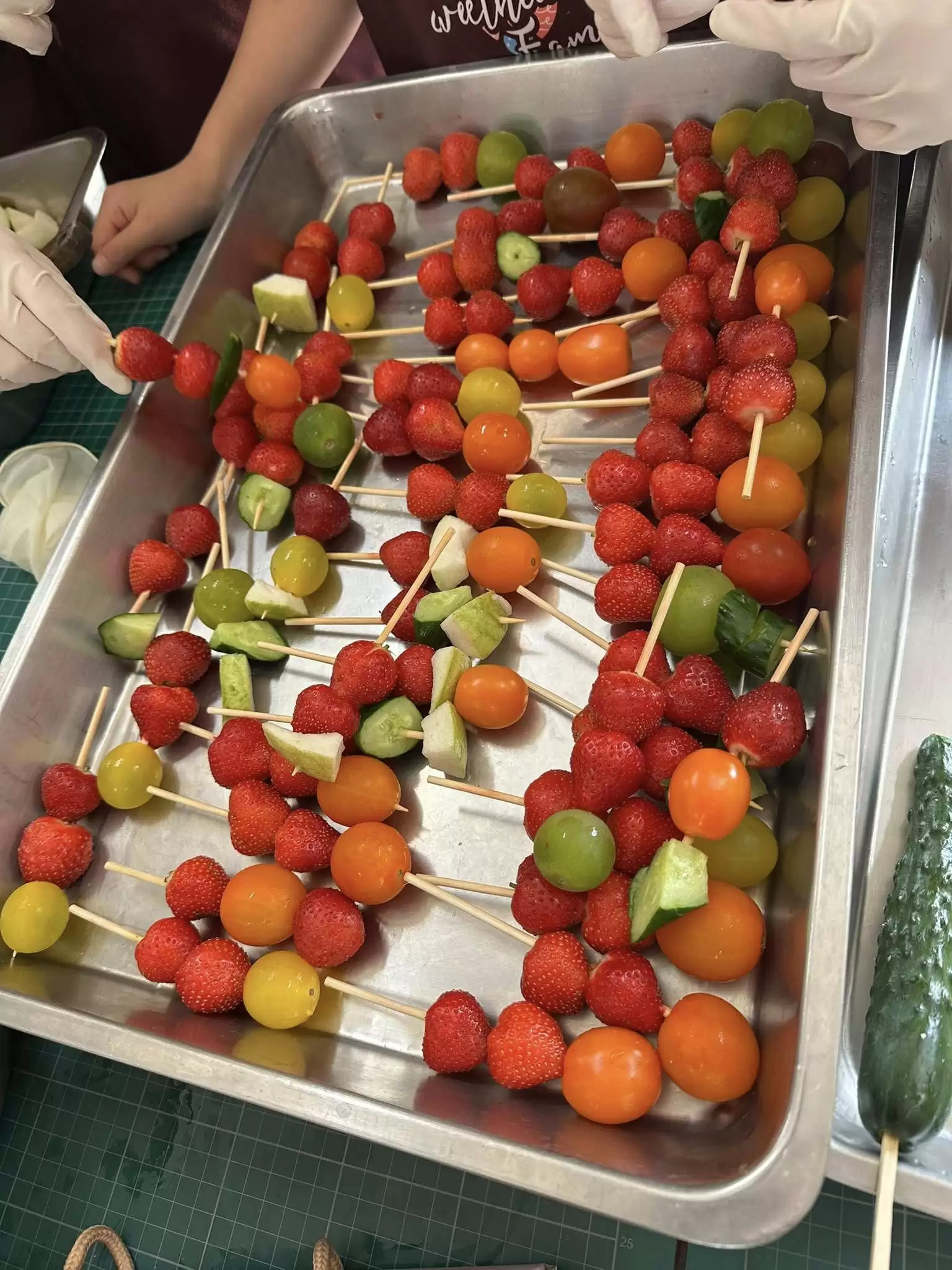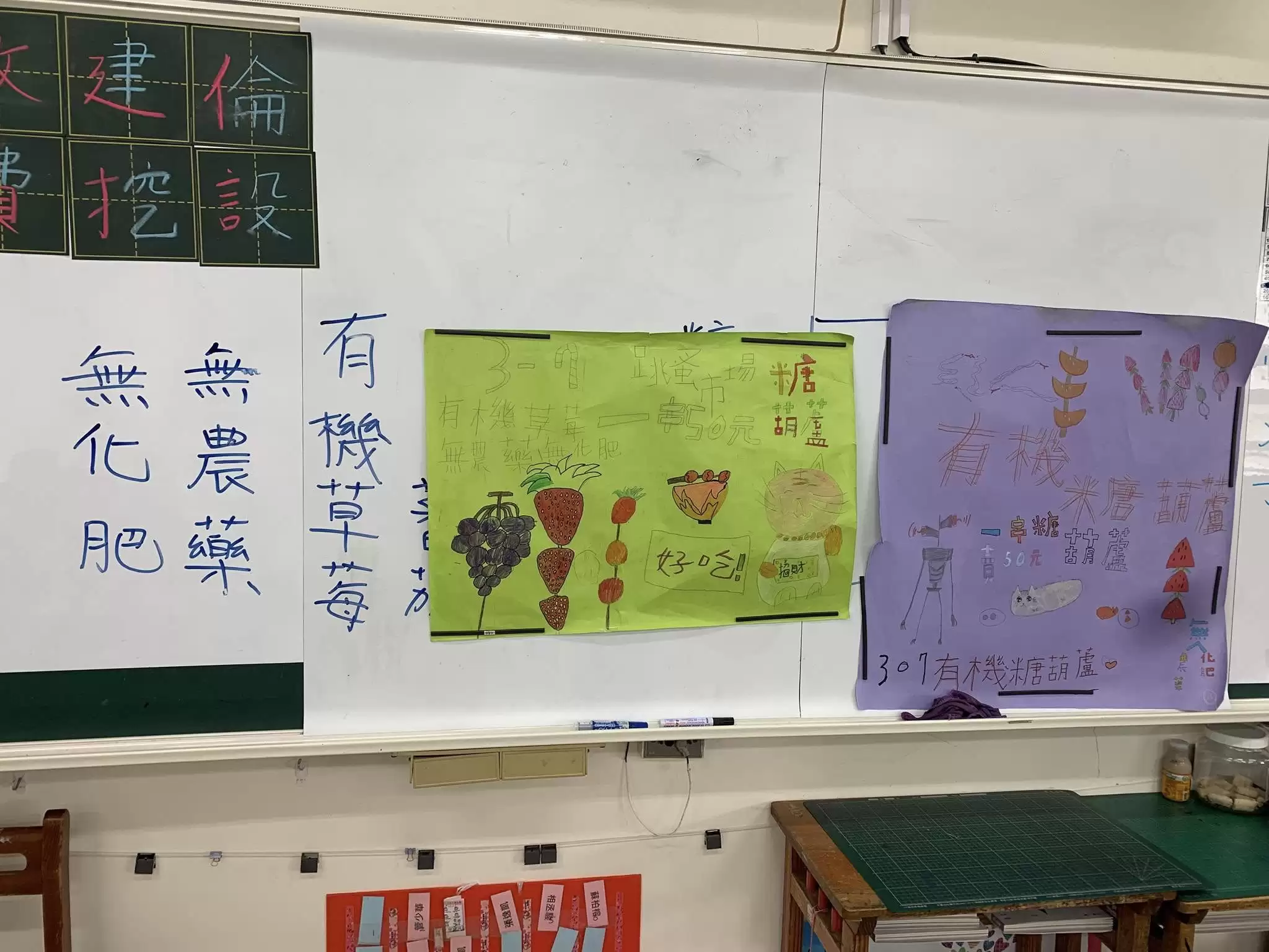 學校的跳蚤市場,配合校本課程,為了推廣有機農法,因而選用有機草莓製作糖葫蘆,過程中為了不使用塑膠袋,我們選用糯米紙,讓客人外帶。從中學習對身體與對環境友善。