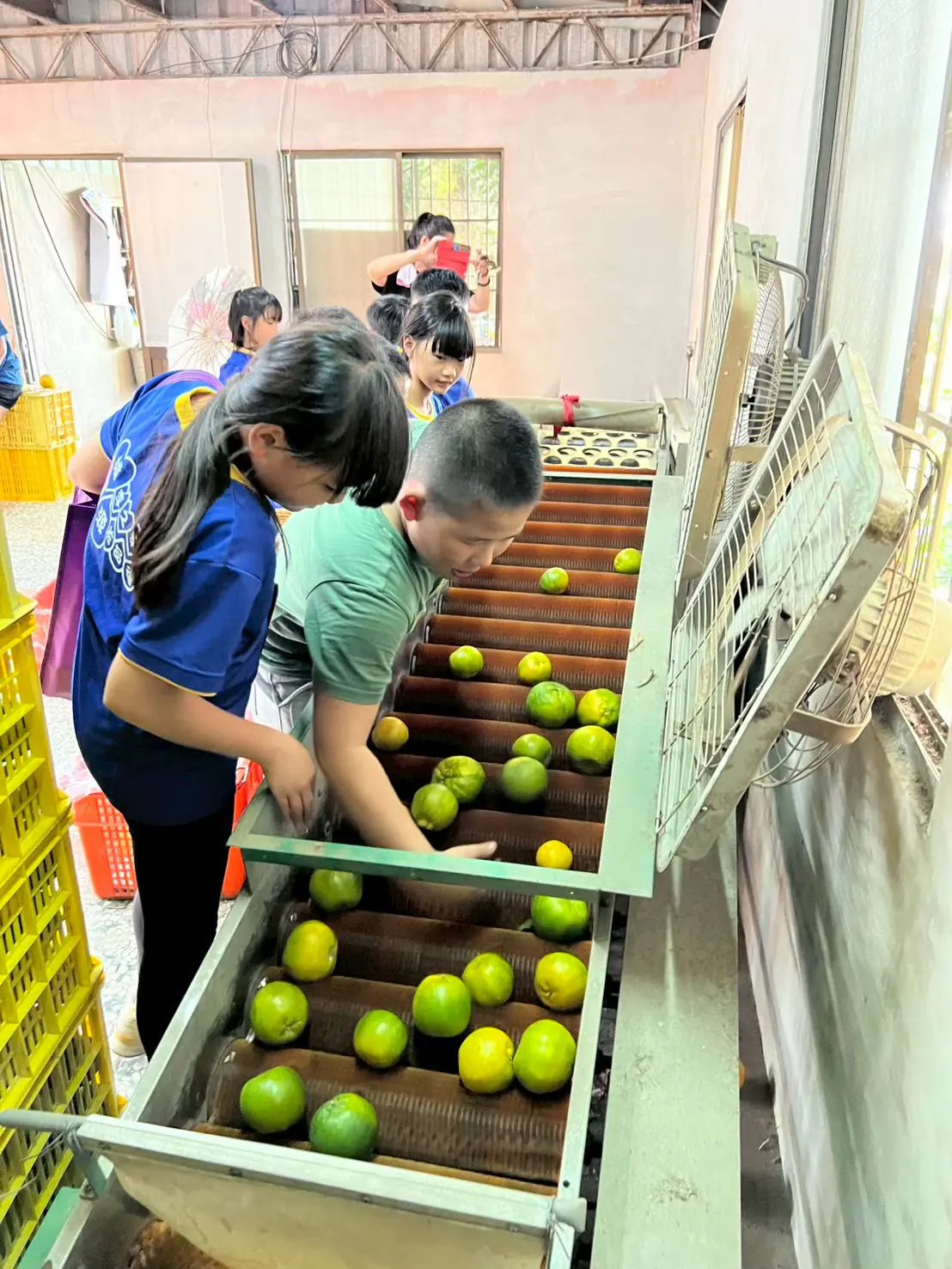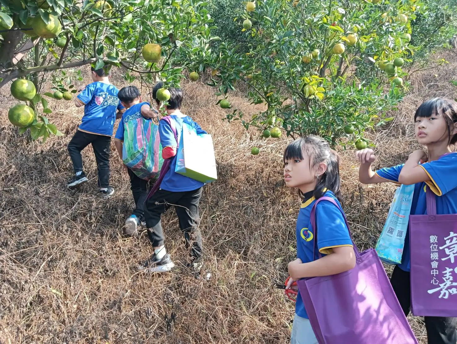 食農教育 認識在地農產橘子,至橘園觀察、學習、採橘子,學習如何將橘子分類(分大小),橘子樹種在斜坡上,我們背著環保袋,爬上爬下忙著探索,對橘子有更進一步的認識,環保袋也裝滿橘子,滿載而歸。