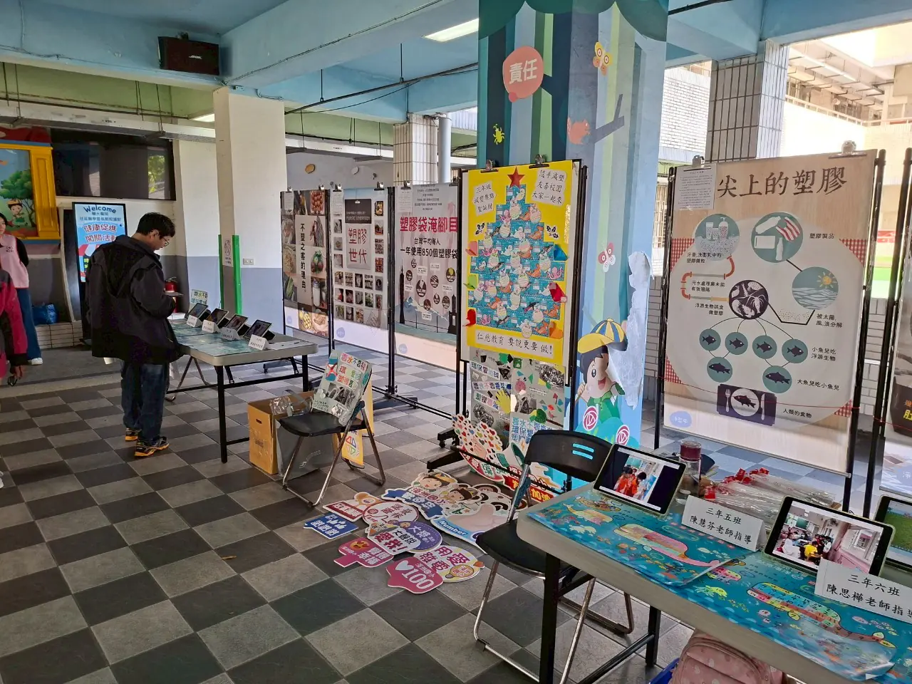 2.減塑海報作品成果展: 在川堂展出三年級的減塑集點成果以及點亮計畫的減塑海報,邀請親子參觀、合照,並贈送前10組合照親子幸福筷樂(筷盒),成功吸引目光,也讓更多家長了減塑的急迫性。