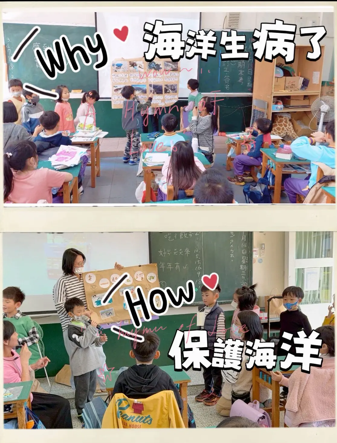 1.影片欣賞 2.孩子們討論海報內容,製作海報(仿寫標題,畫出環保內容),練習輪流分享海報內容 3.分享口號 4.問答時間,並有小禮物喔