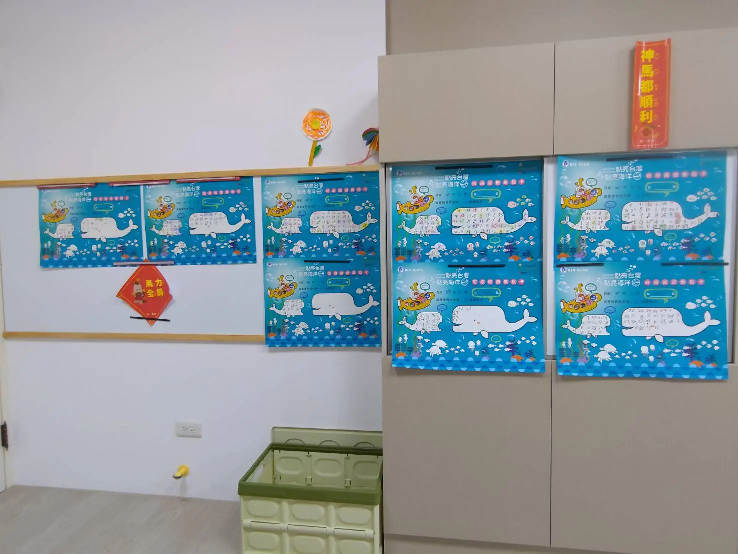 這一學年,學校給了我一間重新裝潢的教室,是經由「新世代學習空間」計劃而來的教學空間。教室裡運用大量活動式且電子化的設備,希望透由先進的設備,讓學生學習使用新式工具來擴展學習的廣度及深度。所以當學生進入這樣的空間學習自然領域知識時,運用提問及驗證讓他們針對議題去學習,水生環境的保護也是其中一主題。最後利用減塑集點卡去實踐保護海洋生物,然後布置在教室角落,成為最美且最有意義的布置。