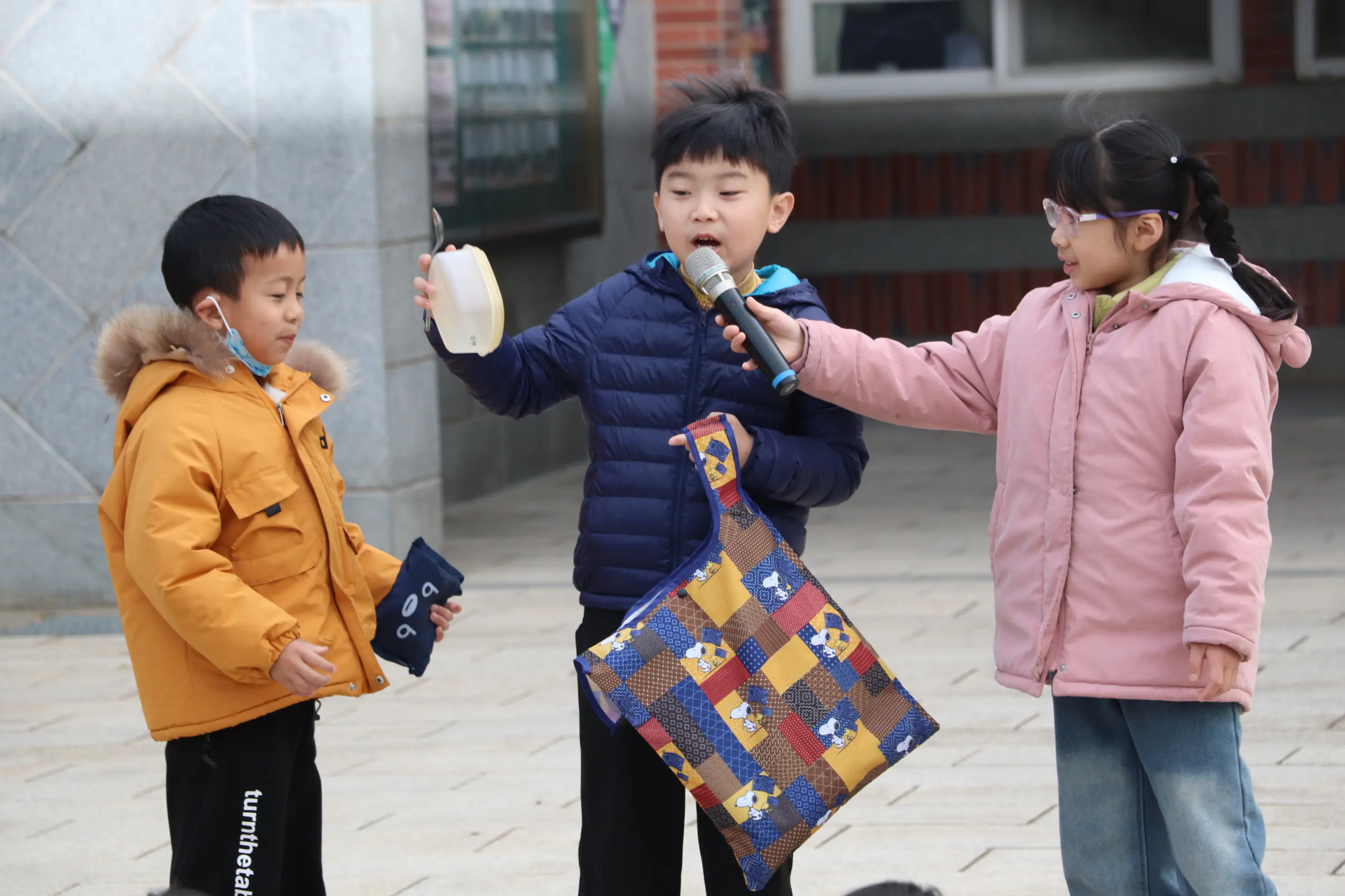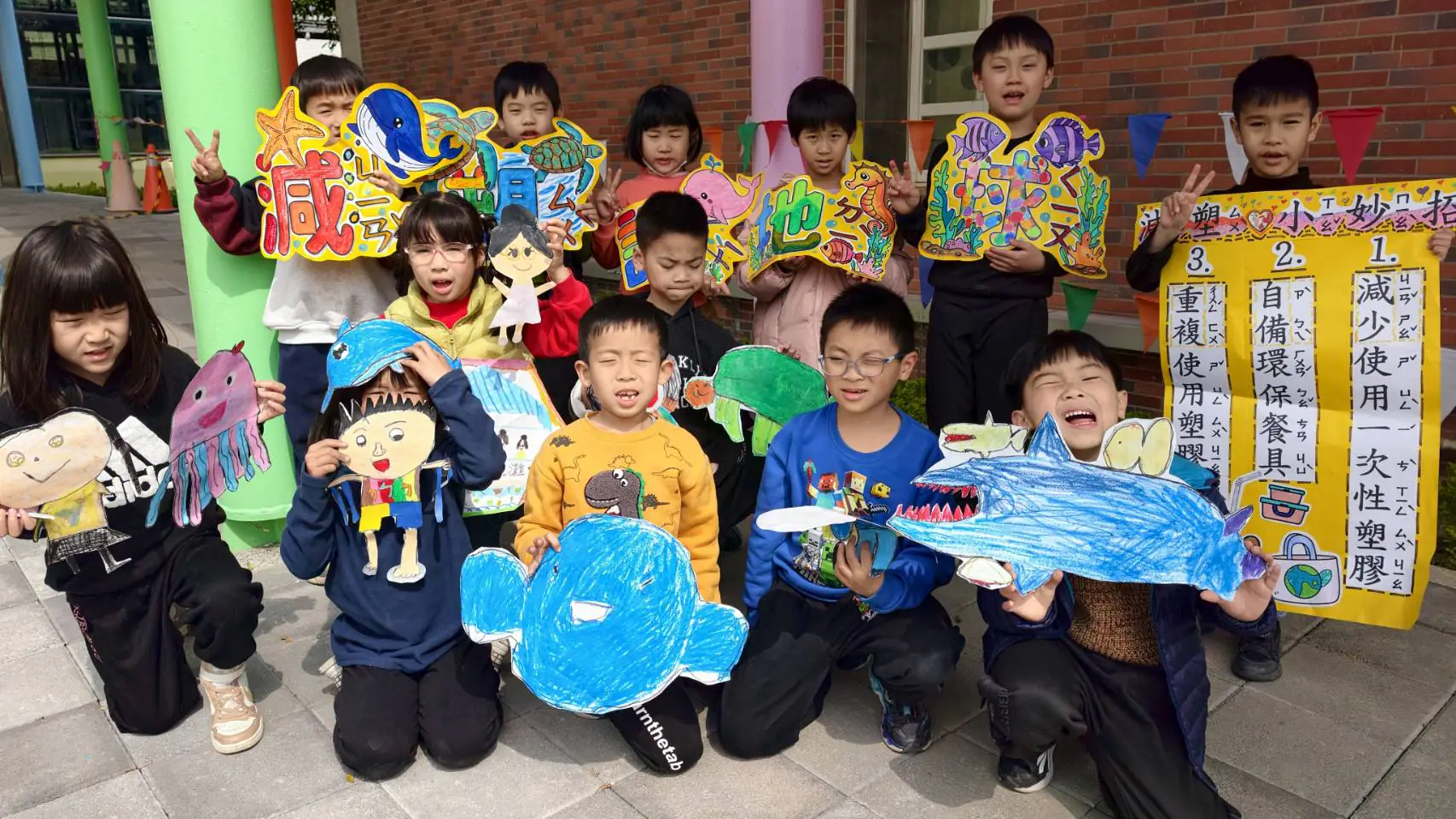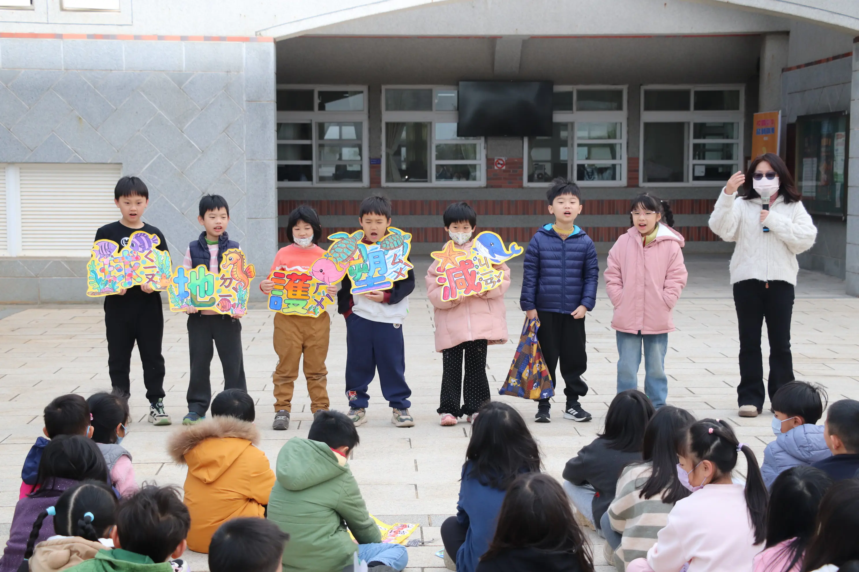 二年級小朋友利用星期一全校升旗時間,向全校師生宣導<減塑護地球>的小妙招,分享自備環保餐具、重複使用塑膠袋及減少一次性餐具等妙招,用行動呼籲全校共創無塑校園!